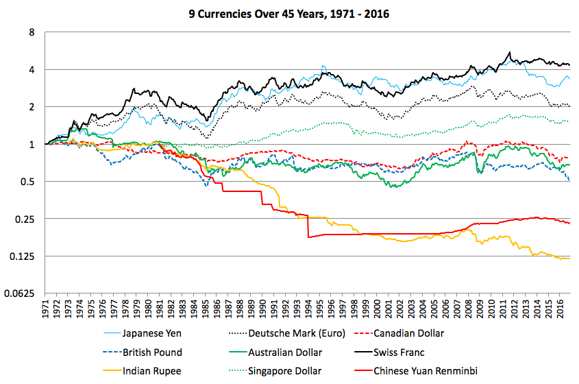 Currency markets, also called Money markets, are the one’s responsible for the transactions between nations, allowing the exchange of commerce to occur without major problems from currency (de)valuation and inflation. On the graphic below, we show the valuation over time of the world’s main currencies against the US Dollar. As we can see, the US Dollar lost value when compared to the Swiss Franc (CHF), the Japanese Yen (JPY), the Euro (EUR) and the Singaporean Dollar (SGD), while it has gained value when compared to the Canadian Dollar (CAD), Australian Dollar (AUD), the British Pound (GBP), the Chinese Renminbi (CNY) and the Indian Rupee (INR).